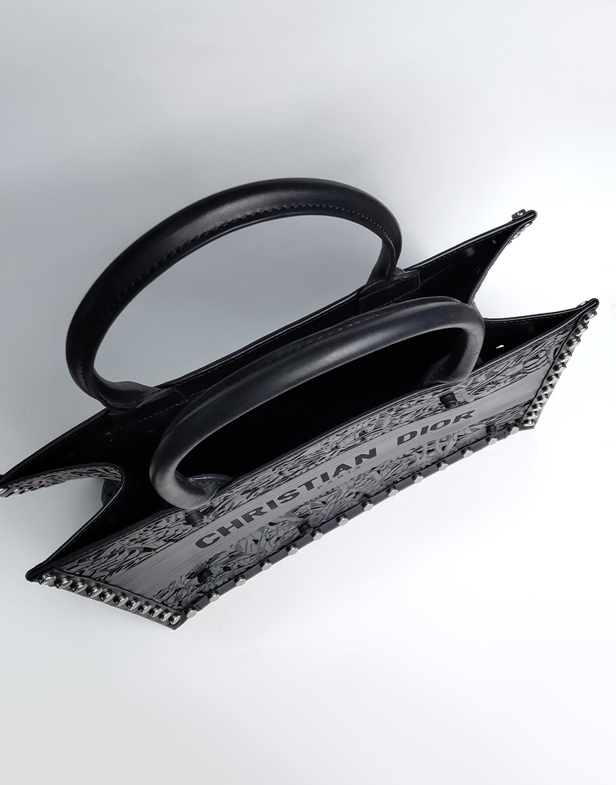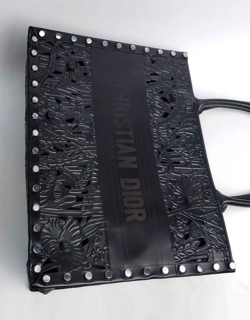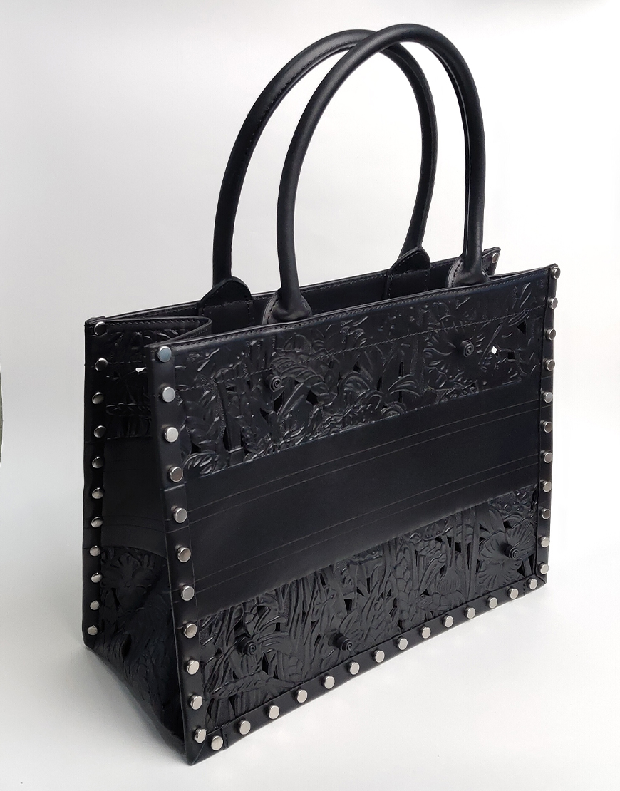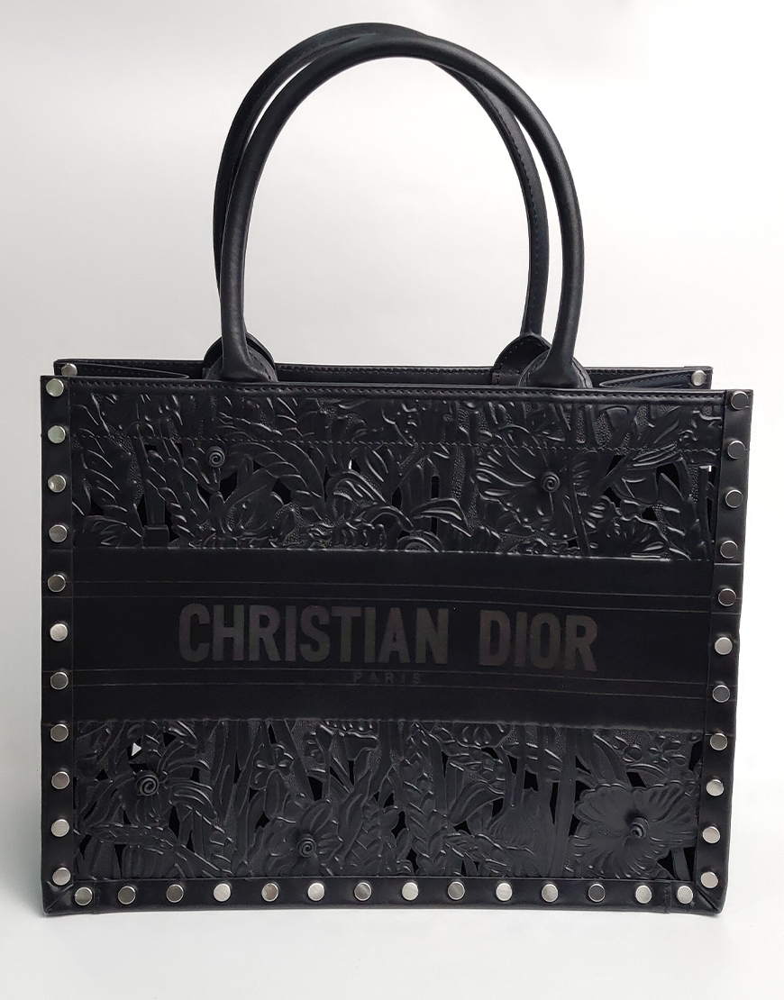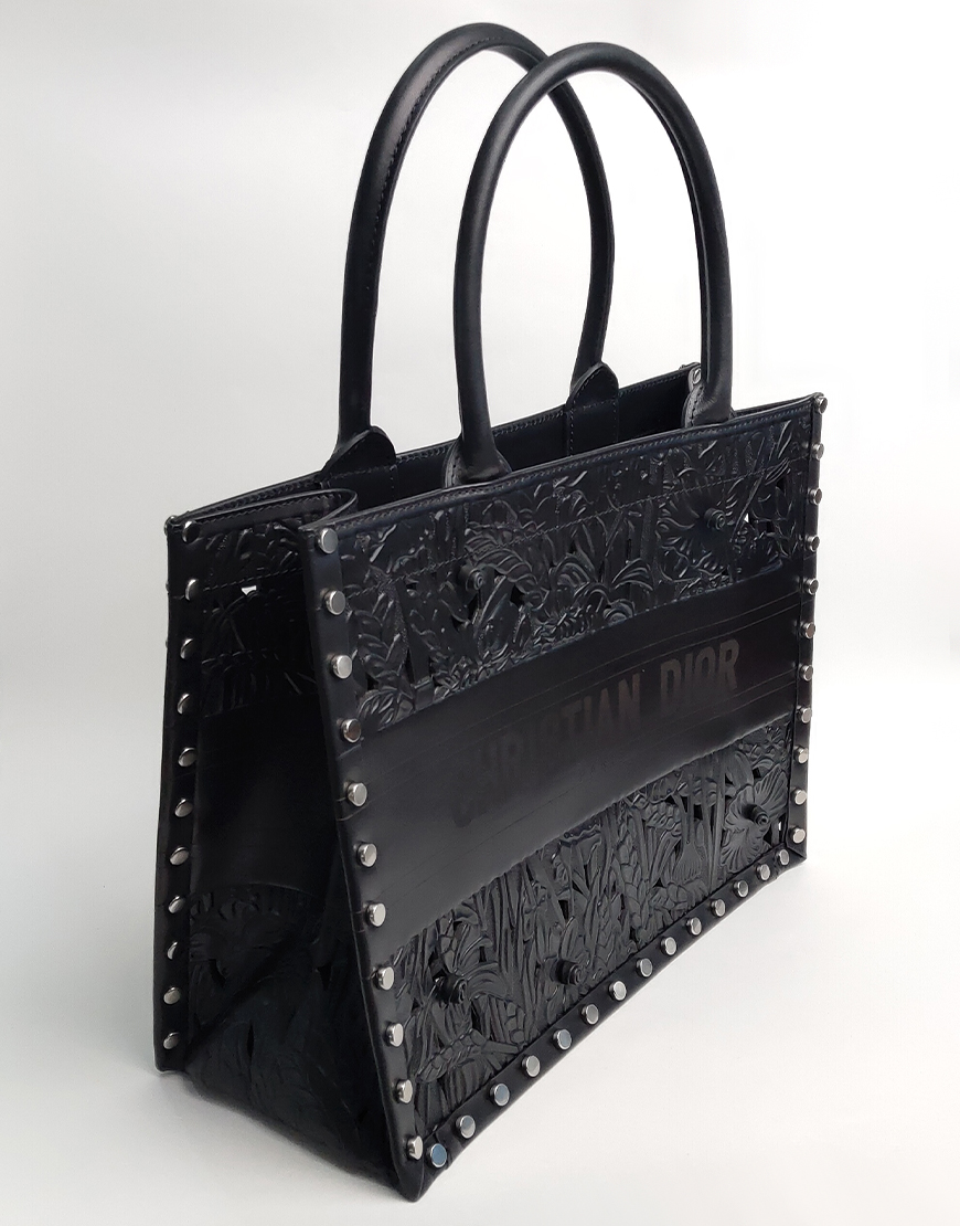 Dior сумка в чёрной коже, с узорами и клёпками.