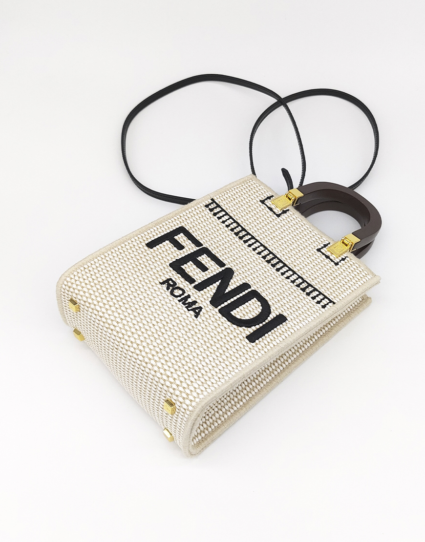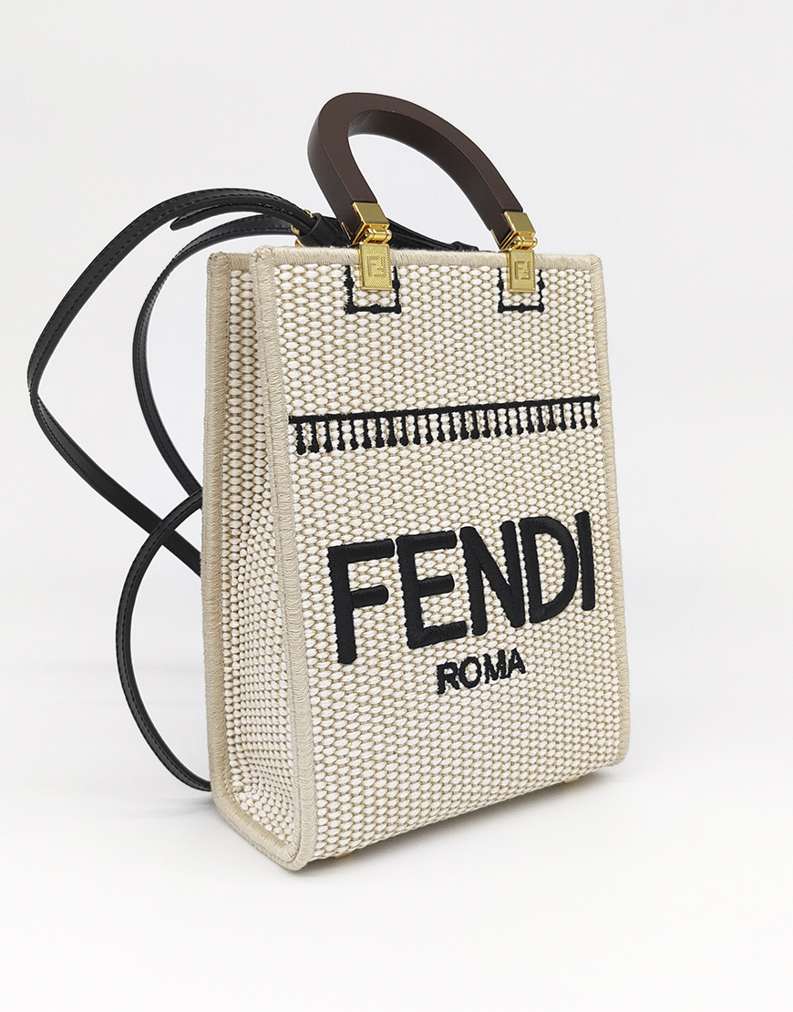 Fendi сумка в бежевом материале с логотипом и деревянными ручками.