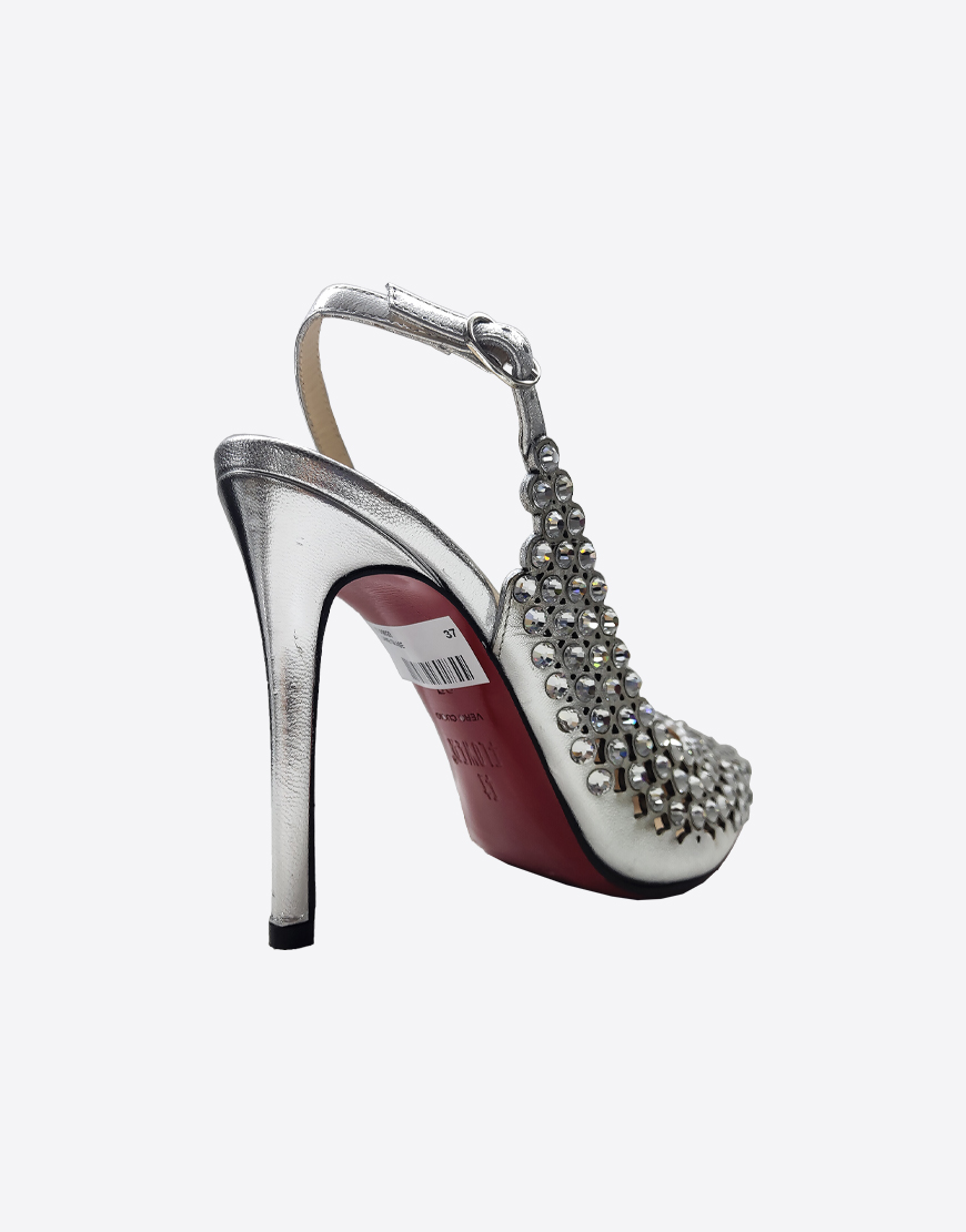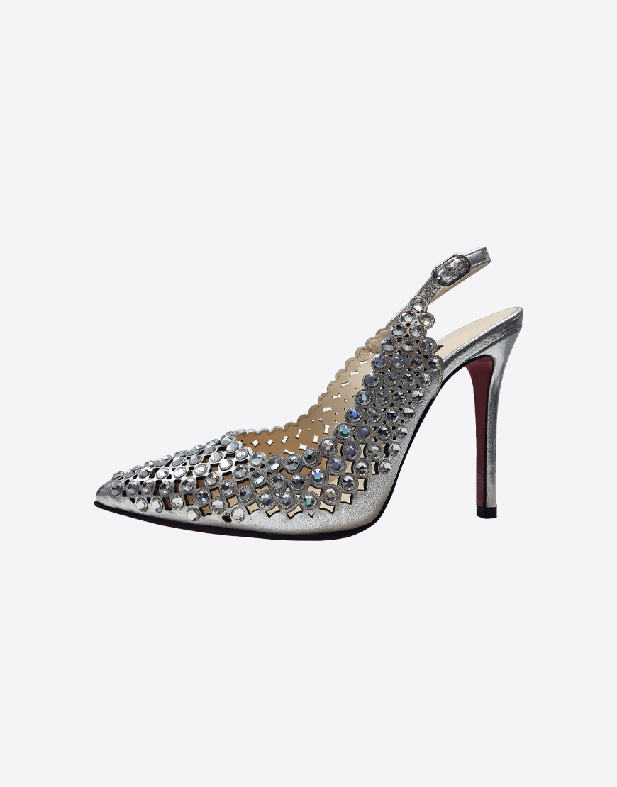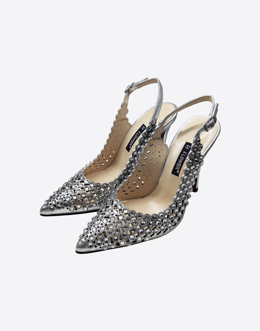 Flower босоножки в серебристой коже, перфорированные, в камнях.