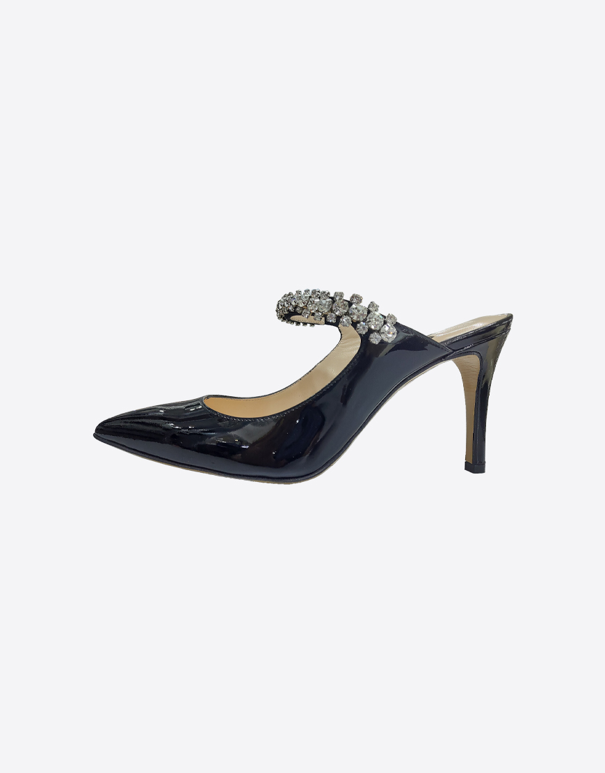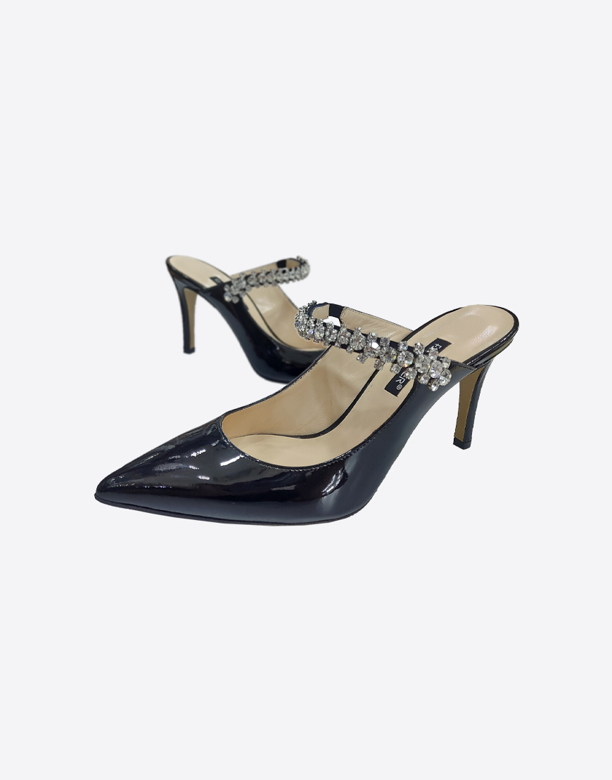 Flower сабо в чёрном лаке, ремешок в камнях.