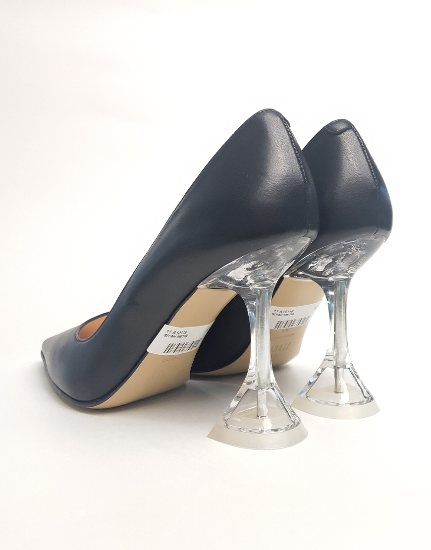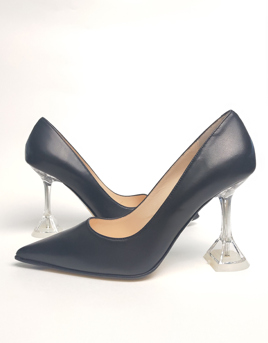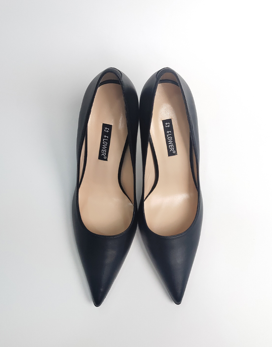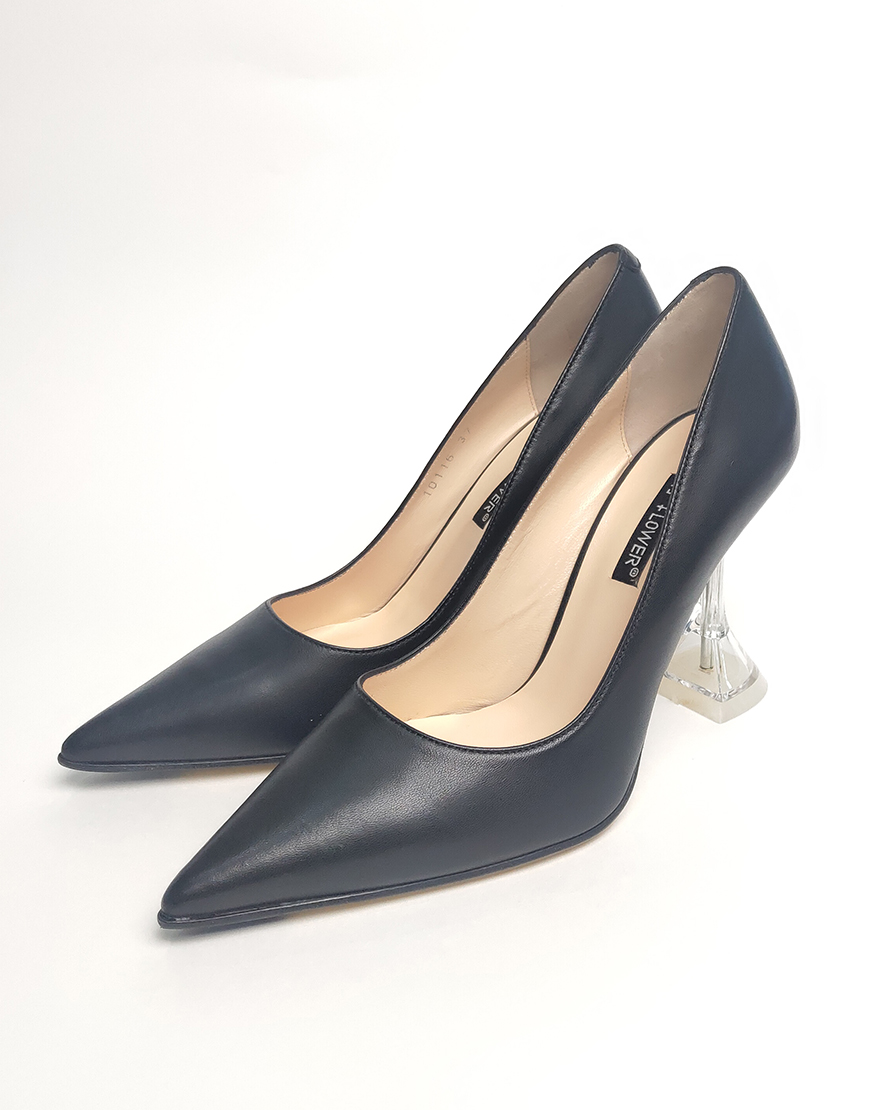 Flower туфли на высоком, в чёрной коже. Каблук в форме рюмки.