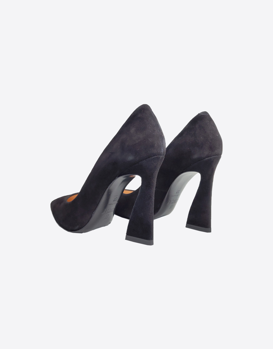 Flower туфли в чёрной замше, с расклешённым каблуком.