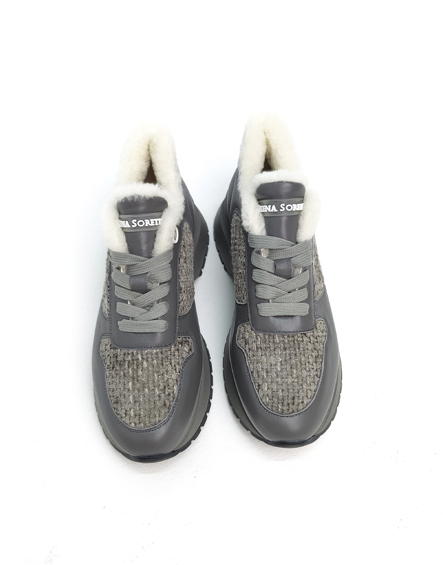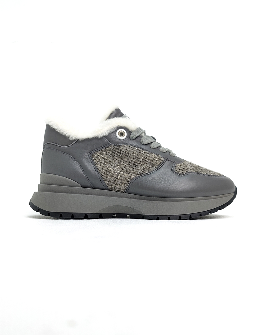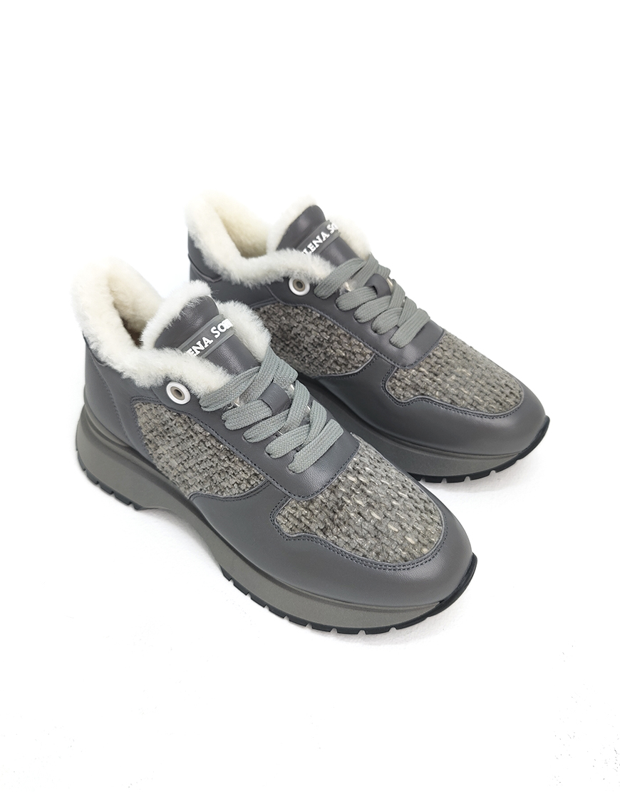 HS кроссовки в серой коже с твидом, на меху.