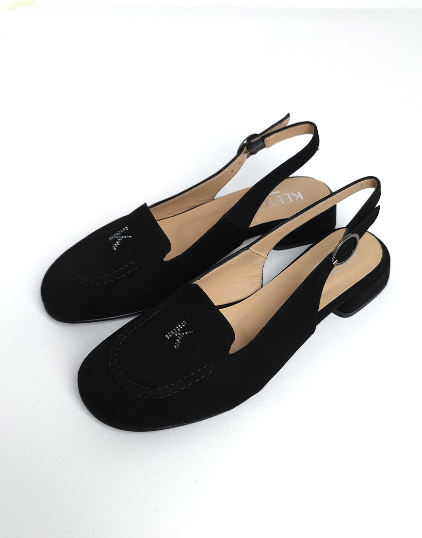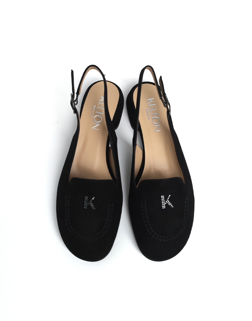 Kelton слингбэки в чёрной замше, с лого в камнях.