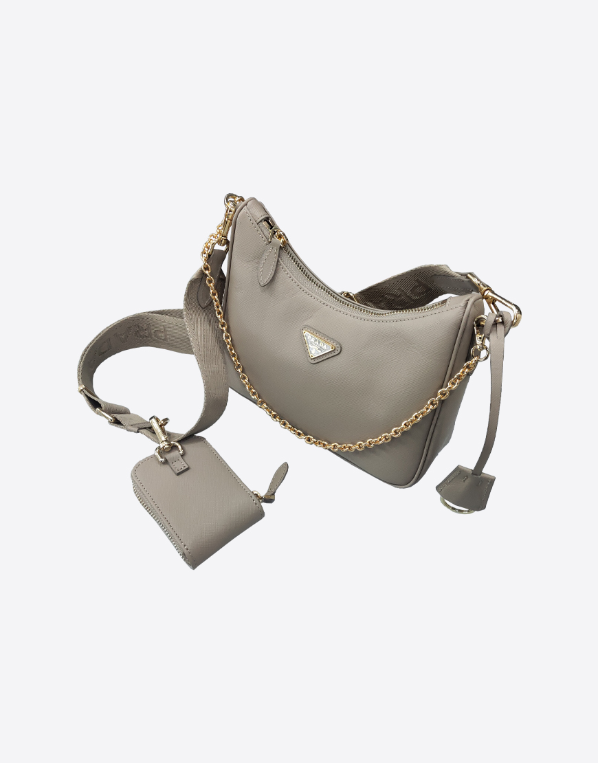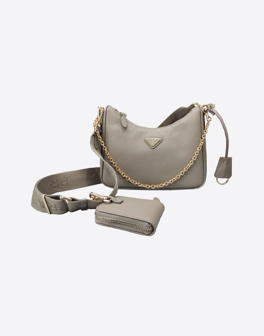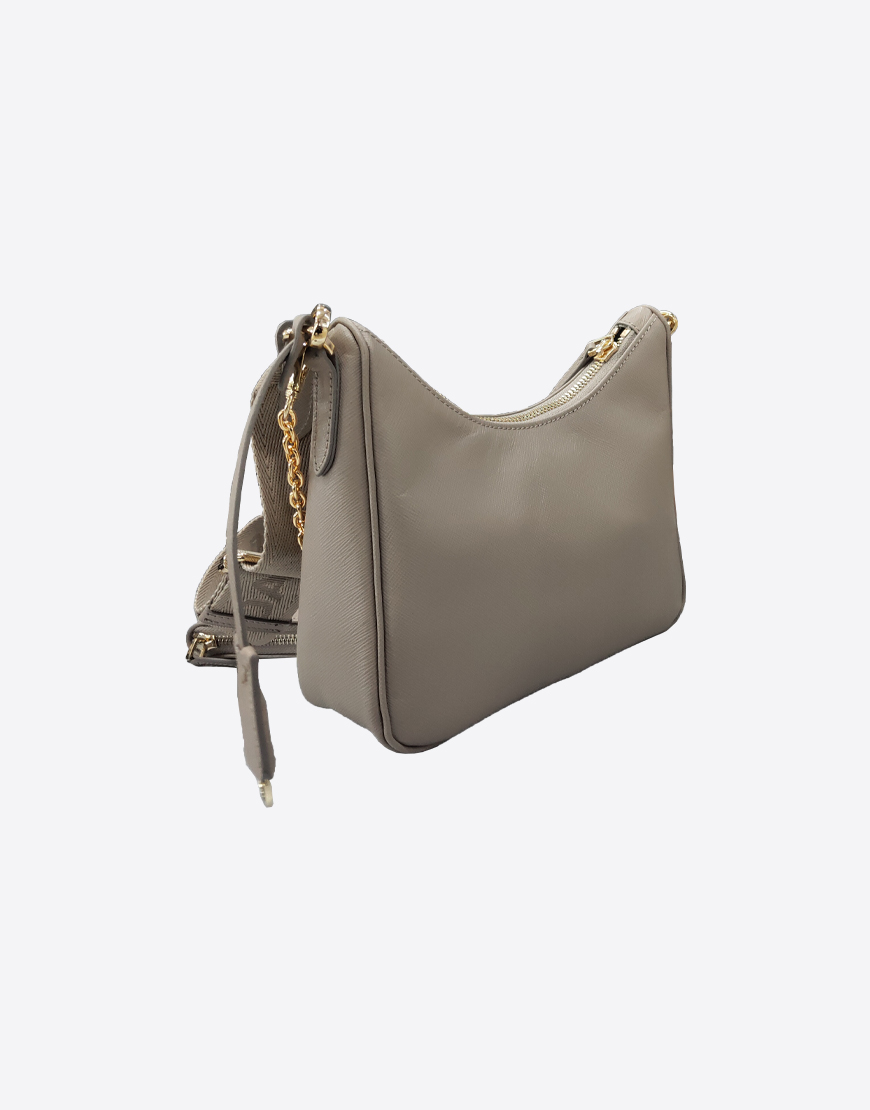 Prada сумочка в бежевой коже, с цепью, с матерчатым ремешком.
